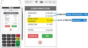 Terminals currently available on the market do not have enough space on their display screens to show the entire transaction information such as the total sale, tip, Non-Cash Charge, and tax lines. Some companies, like PAX, are using the tax line to display the Non-Cash Charge leaving the customer clueless on what the tax fees are on their transactions. Valor has the ability to show all the transactional information for customers to see as well as add additional customized information.
